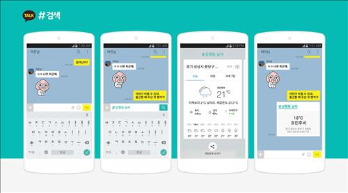 카카오톡 대화 입력창의 #(샵) 버튼을 누르면 검색창으로 바로 전환돼 원하는 키워드를 입력한 뒤 검색 결과를 확인할 수 있고 화면 내 '공유하기' 버튼을 누르는 것만으로 채팅방에 바로 검색 결과를 나눌 수 있도록 했다.