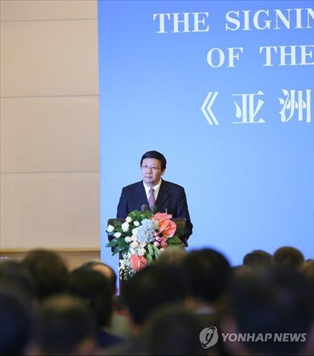 | △ 이준삼 특파원 = 러우지웨이(樓繼偉) 중국 재정부장(장관)이 29일 오전(현지시간) 중국 베이징(北京) 인민대회당에서 열린 아시아인프라투자은행(AIIB) 협정문 서명식에서 기조연설을 하고 있다. |