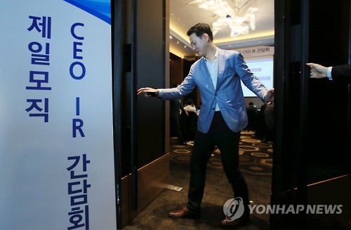 | △ 제일모직 CEO 긴급 기업설명회 개최 (서울=연합뉴스) 홍해인 기자 = 30일 오전 서울 여의도 콘래드호텔에서 제일모직 긴급 기업설명회(IR)가 시작되며 설명회장 문이 닫히고 있다. |