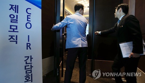 | △ 제일모직 CEO 긴급 기업설명회 개최 (서울=연합뉴스) 홍해인 기자 = 30일 오전 서울 여의도 콘래드호텔에서 제일모직 긴급 기업설명회(IR)가 시작되며 설명회장 문이 닫히고 있다. 2015.6.30 hihong@yna.co.kr |