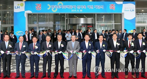 | △ "LH 진주시대 개막합니다" (진주=연합뉴스) 최병길 기자 = 30일 오후 경남 진주혁신도시에서 열린 한국토지주택공사(LH) 신사옥 이전 기념식에서 유일호(오른쪽에서 5번째) 국토교통부장관, 이재영(중앙) LH 사장 등이 축하 테이프를 자르고 있다. 2015.6.30 choi21@yna.co.kr |