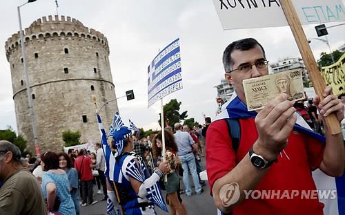 | △ (테살로니키<그리스> AP=연합뉴스) 국제채권단과의 협상결렬로 그리스 위기가 고조되는 가운데 29일(현지시간) 그리스 북부 항구 도시 테살로니키에서 국제채권단 제안 거부 집회가 열려 한 참가자가 1천 드라크마 짜리 예전 그리스 화폐를 들어보이고 있다. 그리스 사태가 디폴트(채무불이행)에 이어 유로존 탈퇴까지 진행되면 유로화 대신 드라크마가 재도입될 가능성이 크다. marshal@yna.co.kr |