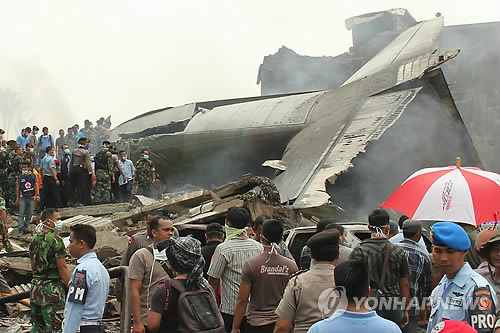 | △ 인도네시아 군 수송기 추락사고 현장 (북수마트라 AP=연합뉴스) 30일 인도네시아 세 번째 대도시인 북(北)수마트라 주 메단 시에서 군용기 추락사고 현장을 군인들이 살펴보고 있다. ciy@yna.co.kr |