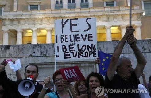 경찰 추산으로 2만명이 참석한 30일(현지시간) 찬성 집회에는 유럽연합(EU) 깃발과 그리스 국기가 나부꼈다.
