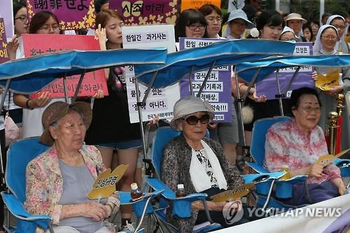| △ 2015년 6월 24일 오후 서울 중학동 일본대사관 앞에서 열린 일본군 위안부 문제 해결을 위한 정기 수요집회에서 위안부 피해자 할머니들이 그늘 의자에 앉아 참가자의 발언을 듣고 있다. |