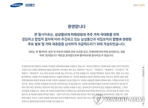 (서울=연합뉴스) 김연숙 기자 = 삼성물산[000830]이 제일모직[028260]과의 합병 안내 홈페이지를 별도로 개설, 합병 성사를 위한 위임장 확보에 적극 나섰다.