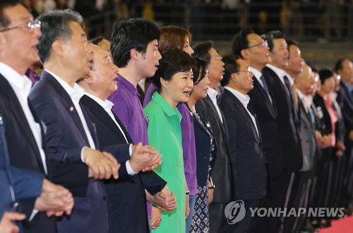 | △ `우리의 소원은 통일' 합창 (서울=연합뉴스) 백승렬 기자 = 박근혜 대통령과 현경대 민주평통 수석부의장 등 참석자들이 1일 서울 올림픽제조경기장에서 열린 제17기 민주평통자문회의 출범식에서 손을 잡고 `우리의 소원은 통일' 노래를 합창하고 있다. |