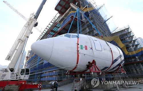 (부산=연합뉴스) 조정호 기자 = 글로벌 직업체험 테마파크 키자니아가 2일 오전 부산시 해운대구 신세계 센텀시티 B부지 건설현장에 보잉737 동체를 설치했다.