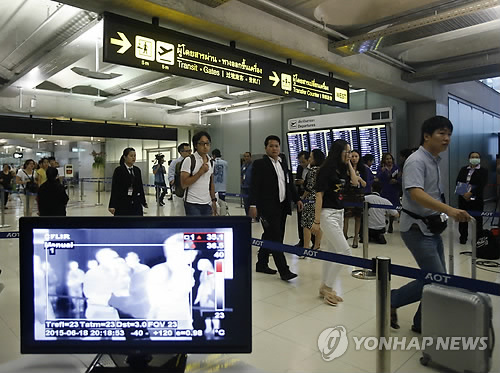 | △ 열감지기 설치한 태국 공항 (방콕 AP=연합뉴스) 19일(현지시각) 태국 방콕 수완나품 공항에 열감지기가 설치돼 있는 모습. 전날 태국에서 첫 번째 메르스 감염 확진 사례가 발생했다. ciy@yna.co.kr |