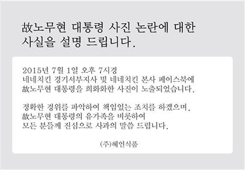 네네치킨은 사과문을 통해 "경기서부지사의 페이스북 담당직원이 올린 글"이라며 "현재 휴가로 해외에 체류하고 있는 이 직원은 전화통화에서 '고 노무현 대통령을 비하하려는 의도는 전혀 없었고 서민 대통령과 서민 치킨이 잘 어울릴 것 같아서 인터넷상에 떠도는 사진을 사용해 제작했다'고 말했다"고 밝혔다.