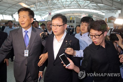 | △ 사고현장으로 출발하는 정재근 차관 (영종도=연합뉴스) 이정훈 기자 = 정재근 행정자치부 차관이 2일 오전 인천국제공항을 통해 중국 지린 성 버스 추락사고 대응팀과 함께 사고현장으로 출발하며 취재진의 질문을 받고 있다. |