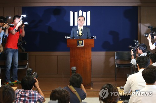 | △ 成 리스트 수사결과 발표 (서울=연합뉴스) 서명곤 기자 = 성완종 전 경남기업 회장의 정치권 금품제공 의혹을 수사한 검찰 특별수사팀 문무일 팀장(검사장)이 2일 서울 서초구 서초동 서울중앙지검에서 중간수사결과를 발표하고 있다. |