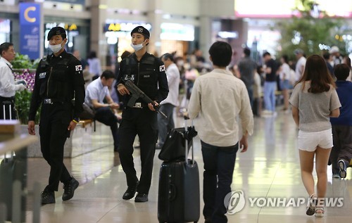 | △ 광주 U대회 앞두고 공항 보안 강화 (영종도=연합뉴스) 홍해인 기자 = 24일 오후 인천국제공항 입국장에서 경찰특공대원들이 경계 근무를 서고 있다. 국토교통부는 7월 3∼14일 광주와 전남·북도, 충북에서 열리는 '2015 광주 유니버시아드대회'를 앞두고 인천·김포공항과 광주·무안·여수·군산·청주 공항 등 7개 공항의 항공보안등급을 26일부터 7월 17일까지 22일간 '관심'보다 한 단계 높은 '주의' 등급으로 강화한다고 밝혔다. 2015.6.24 hihong@yna.co.kr |