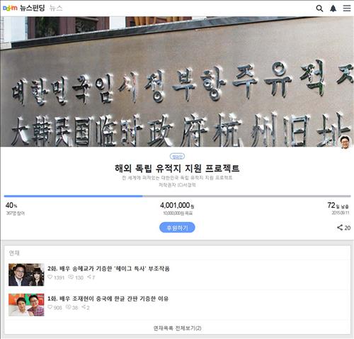 그는 "더욱 다양한 크라우드 펀딩 방식을 동원해 이번 캠페인을 광복 70주년인 올해부터 3·1 운동 100주년인 2019년까지 이어가겠다"고 의지를 내비쳤다.