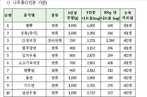 식약처는 315개 품목의 나트륨 함량을 비교한 결과 전반적으로 국물 음식의 나트륨 함량이 높게 나타났다며 나트륨 섭취량을 줄이기 위해서 건더기 위주로 섭취하는 식습관을 가져야 한다고 당부했다.