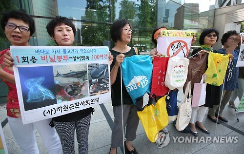 자원순환사회연대는 이날 캠페인에서 국내에서 사용되는 1회용 비닐봉지가 연간 약 190억장, 이로 인한 이산화탄소 배출량은 247만t이라고 설명했다.