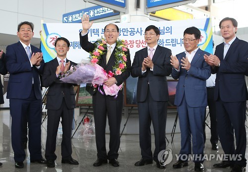 | △ '금의환향'하는 임기택 IMO 사무총장 (부산=연합뉴스) 김선호 기자 = '세계 해양 대통령'으로 불리는 국제해사기구에서 첫 한국인 사무총장이 된 임기택 사무총장 당선인이 3일 오전 부산역에서 꽃다발을 받고 손을 흔들고 있다. 2015.7.3 wink@yna.co.kr |