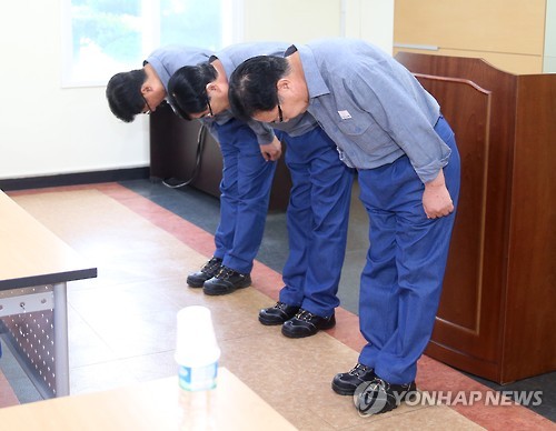 | △ 폭발사고 사과하는 김창범 대표이사 (울산=연합뉴스) 김용태 기자 = 3일 울산시 남구 한화케미칼 2공장 폐수처리장 저장조에서 발생한 폭발사고와 관련해 한화케미칼 김창범 대표이사(맨 오른쪽)와 관계자들이 사과하고 있다. 이번 폭발사고로 6명이 숨졌다. |