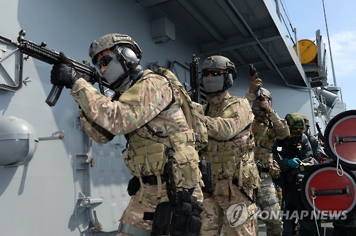 | △ "동해 완벽히 지킨다"…해군 1함대 종합전투훈련 (동해=연합뉴스) 해군 제1함대사령부가 적 도발에 확고한 대비태세를 확립하고자 1주일간 실시한 함대 종합전투훈련이 4일 끝났다. 지난달 28일부터 4일까지 이뤄진 이번 훈련에서는 12종목의 해상기동훈련과 육상 야외기동훈련(FTX)이 시행됐다. 해군 3특전대대 장병이 가상의 적함인 광개토대왕함에 탑승해 승선검색과 나포 훈련을 하고 있다. 2015.7.4 <<해군 1함대>> yoo21@yna.co.kr |
