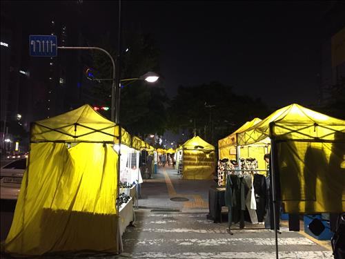 몇 년 전 같으면 옷과 핸드백 등을 파는 노점상과 손님이 뒤섞여 불야성을 이뤘을 시간이지만 이날은 불과 40여개의 노점이 드문드문 손님을 기다리고 있었다.