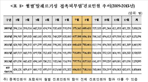 국민건강보험공단은 2009년부터 2013년까지 알레르기성 접촉피부염으로 병원을 찾은 평균 진료인원을 분석한 결과 7~8월에 환자가 각각 68만4천825명과 71만233명으로 가장 많았다고 5일 밝혔다.