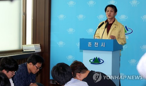 | △ 강원 여섯번째 메르스 확진관련 브리핑 (춘천=연합뉴스) 이상학 기자 = 강원도 내에서 여섯 번째 중동호흡기증후군(메르스) 확진자가 발생한 가운데 5일 춘천시보건소 안동탁 소장이 방역대책에 대해 브리핑을 하고 있다. 2015.7.5 hak@yna.co.kr |