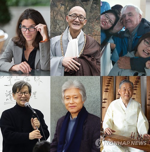 | △ 올해 만해대상에 알렉시스 더든 교수 등 (서울=연합뉴스) 만해사상실천선양회는 제19회 만해대상 수상자로 미국 역사학자인 알렉시스 더든코네티컷대 교수 등 6명을 선정했다. 윗줄 왼쪽부터 시계방향으로 알렉시스 더든코네티컷대 교수, 창전 스님, 사회복지법인 무지개공동회, 가야금 명인 황병기, 시인 정현종, 신영복 성공회대학교 석좌교수. 2015.7.5 << 만해사상실천선양회 제공 >> photo@yna.co.kr |