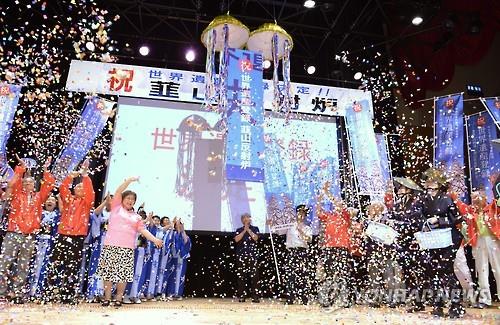 | △ 일본 정부가 추천한 23개 산업 시설이 5일 세계유산에 등재되자 이 소식을 전해 들은 주민들이 시즈오카(靜岡)현 이즈노쿠니(伊豆の國)시에서 미리 준비한 축하용 소품을 터뜨리면서 환호하고 있다. (교도=연합뉴스) |