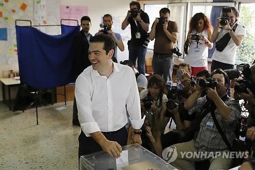 | △ (아테네 AP=연합뉴스) 국제 채권단의 채무 협상안 수용 여부를 묻는 그리스 국민투표가 전세계의 이목 집중을 받으며 5일 오전(현지시간) 막을 올린 가운데 알렉시스 치프라스 총리도 아테네 투표장에서 한 표를 행사하고 있다. |