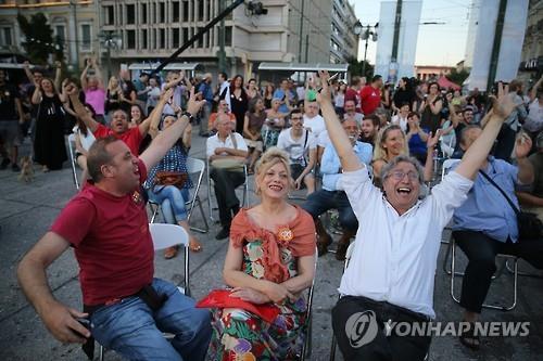 | △ (아테네 EPA = 연합뉴스) 그리스가 5일(현지시간) 실시한 국민투표에서 반대가 결정되자 아테네 도심 신타그마 광장에 모인 시민들이 환호하고 있다. |