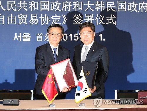 | △ 지난 6월 1일 서울 용산구 소월로 그랜드하얏트 호텔에서 열린 '한-중 자유무역협정(FTA) 서명식'에서 윤상직 산업통상자원부 장관(오른쪽)과 가오후청 중국 상무부장이 서명을 한 뒤 포즈를 취하고 있다. (연합뉴스 자료사진) |