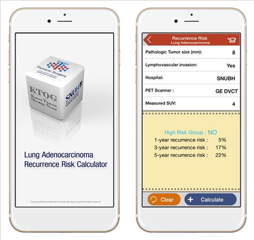 이 앱은 사용자가 종양 크기와 폐조직 내 림프계 침윤 여부, PET(양성자단층촬영) 검사 수치 등을 입력하고 계산 버튼을 누르면 폐암 재발 고위험군인지, 저위험군인지를 알려주고 1년, 3년, 5년 후 재발 확률을 각각 백분율로 보여준다.