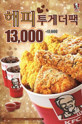 KFC는 우선 이달 말까지 핫크리스피치킨 3조각·스윗갈릭치킨 3조각·소스 2개·콜라(미듐) 2개로 구성된 '해피투게더팩'을 단품들 합계 가격보다 30% 싼 1만3천원에 내놓는다.