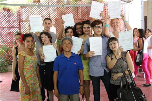 | △ (아바나<쿠바>=연합뉴스) 장현구 특파원 = 지난 2012년 쿠바 아바나에 개설된 한국어 강좌가 3년 만인 4일(현지시간) 첫 수료생 11명을 배출했다. 수료생들이 김익환 교수(사진 가운데)를 중심으로 수료증을 흔들고 있다. 2015.7.6 cany9900@yna.co.kr |