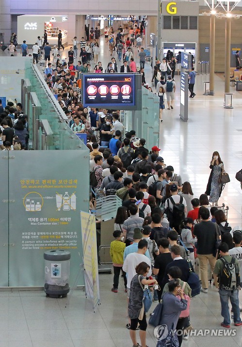 | △ 붐비는 인천공항 출국장 (영종도=연합뉴스) 이정훈 기자 = 2일 오전 인천국제공항 출국장이 해외로 떠나는 여행객으로 붐비고 있다. 인천국제공항 이용객 수가 전주 대비 증가세를 나타내며 중동호흡기증후군(메르스) 여파에서 회복하는 조짐을 보이고 있다. 2015.7.2 uwg806@yna.co.kr |
