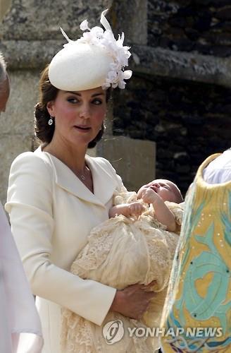 (런던 AP=연합뉴스) 윌리엄 영국 왕세손 부부의 둘째 샬럿 공주가 태어난 지 9주 만인 5일(현지시간) 세례를 받고 두 번째로 세상에 모습을 드러냈다.