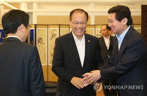 | △ 인사나누는 황우여 이상일 김재춘 (서울=연합뉴스) 진성철 기자 = 황우여 교육부 장관(가운데), 김재춘 교육부 차관(왼쪽)과 새누리당 이상일 의원이 6일 국회 귀빈식당에서 열린 사학연금개정을 위한 당정협의에서 인사하고 있다. 2015.7.6 zjin@yna.co.kr |