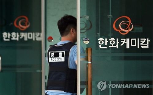 | △ 경찰, 폭발사고 낸 한화케미칼 울산공장 압수수색 (울산=연합뉴스) 김용태 기자 = 울산 남부경찰서는 폐수처리장 저장조 폭발로 협력업체 근로자 6명이 숨지는 사고가 발생한 한화케미칼 울산2공장에 대해 4일 압수수색을 실시했다. 이날 경찰 관계자가 압수수색 대상이 된 한화케미칼 환경안전팀 사무실로 들어가고 있다. 2015.7.4 yongtae@yna.co.kr |