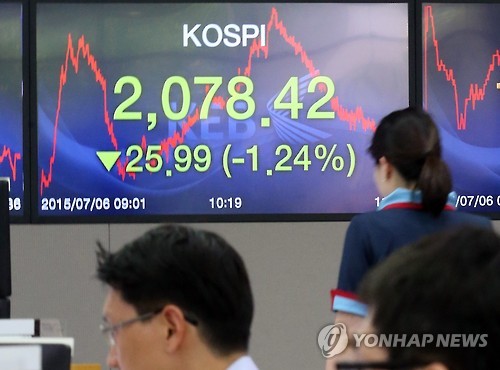 전 거래일보다 28.35포인트(1.35%) 내린 2,076.06으로 개장한 코스피는 오후 들어 외국인과 기관의 매도세가 커지면서 시간이 흐를수록 하락폭을 키웠다.