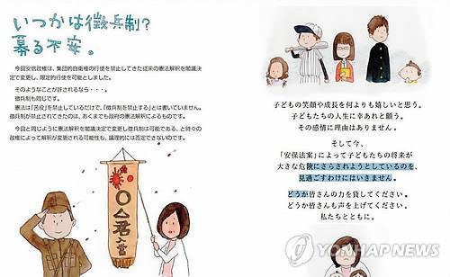 (도쿄=연합뉴스) 조준형 특파원 = 일본 제1야당인 민주당이 아베 정권의 집단 자위권 법안을 비판한 홍보물에서 징병제 부활 가능성에 우려를 표명해 눈길을 모았다.