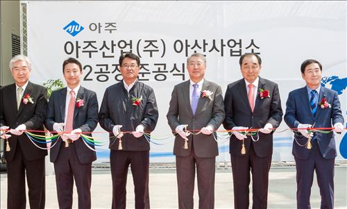 | △ 아주산업이 지난 6일 충남아산사업소에 대구경 PHC파일 공장을 준공했다. 문규영 아주그룹 회장(오른쪽 세번째)을 비롯해, 윤병은 아주산업 대표(오른쪽 두번째) 등이 기념촬영을 하고 있다. (사진 아주산업 제공) |