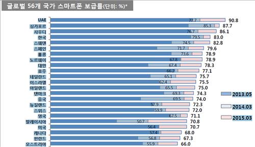 KT경제경영연구소는 8일 내놓은 '2015년 상반기 모바일 트렌드' 보고서에서 한국의 스마트폰 보급률은 지난 3월 기준으로 83.0%에 달해 아랍에미리트(UAE·90.8%), 싱가포르(87.7%), 사우디아라비아(86.1%)에 이어 세계 4위로 나타났다고 밝혔다.