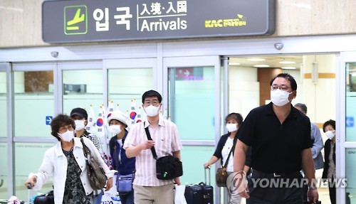 | △ 입국하는 외국인 관광객 (서울=연합뉴스) 박정헌 기자 = 중동호흡기증후군(메르스) 추가 환자가 이틀 연속 나오지 않은 가운데 7일 오후 서울 강서구 김포공항에서 마스크를 쓴 외국인 관광객이 입국장을 나서고 있다. 2015.7.7 home1223@yna.co.kr |