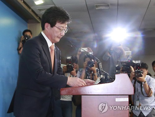 | △ 굳은 표정의 유승민 (서울=연합뉴스) 이상학 기자 = 새누리당 유승민 원내대표가 8일 오후 국회 정론관에서 원내대표 사퇴 기자회견을 마친 뒤 굳은 표정을 보이고 있다. |
