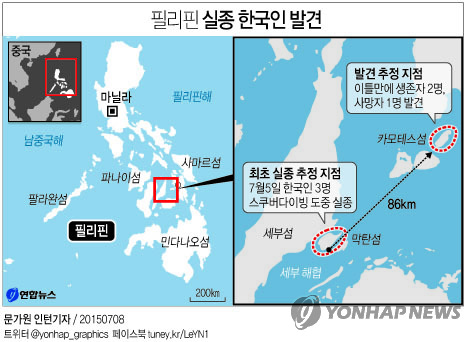 일행으로 알려진 이들 3명은 지난 5일 오전(현지시간) 막탄섬 주변 해상에서 스쿠버다이빙 도중 실종돼 구조대원들이 수색을 벌여 왔다.