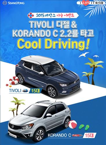 '바캉스 시승단'도 모집한다. 오는 22일까지 응모를 접수하고 추첨을 통해 오는 31일부터 8월 5일까지 5박6일 동안 티볼리 디젤(15대)과 코란도 C LET 2.2(15대) 등 총 30대를 시승차로 제공한다.