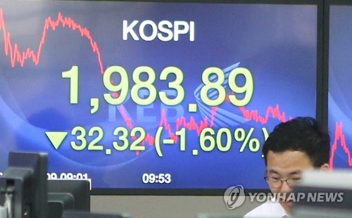 | △ 중국 증시 위기.. 코스피 2000선 붕괴 (서울=연합뉴스) 박정헌 기자 = 한 달 새 30% 넘게 폭락한 중국 증시의 위기가 우리나라를 포함한 세계 증시로 전염될 수 있다는 우려가 커지면서 심리적 지지선으로 여겨지던 코스피 2,000선이 장중 무너졌다. 9일 오전 현재 서울 외환은행 딜링룸 전광판에 코스피지수가 전날보다 32.32포인트(1.60%) 떨어진 1983.89를 나타내고 있다. |