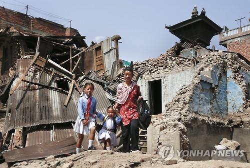 | △ 5월321일 네팔 카트만두 외곽 분그마티에서 어린이들이 어머니의 손을 잡고 등교하고 있다.(EAP=연합뉴스 자료사진) |