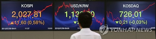 | △ 코스피 2,027.81, 코스닥 726.01 마감 (서울=연합뉴스) 신준희 기자 = 코스피가 9일 중국 증시의 급등락에 덩달아 큰폭으로 오르내렸다. 이날 코스피는 전날보다 11.60포인트(0.58%) 상승한 2,027.81로 장을 마감했다. 코스닥은 전날보다 0.21포인트(0.03%) 하락한 726.01로 장을 마쳤다. 코스닥지수는 6일 이후 4거래일째 하락했지만 낙폭은 점차 줄어 하락세가 진정되는 모습을 보이고 있다. 사진은 이날 오후 서울 명동 외환은행 본점 딜링룸. hama@yna.co.kr |