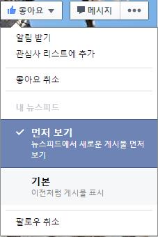 그러면 '먼저 보기(뉴스피드에서 새로운 게시물 먼저 보기)'와 '기본(이전처럼 게시물 표시)' 중 하나를 택할 수 있으며, 여기서 '먼저 보기'를 선택하면 이 친구 혹은 페이스북 페이지의 새 게시물이 사용자의 뉴스피드 상단에 우선적으로 표시된다
